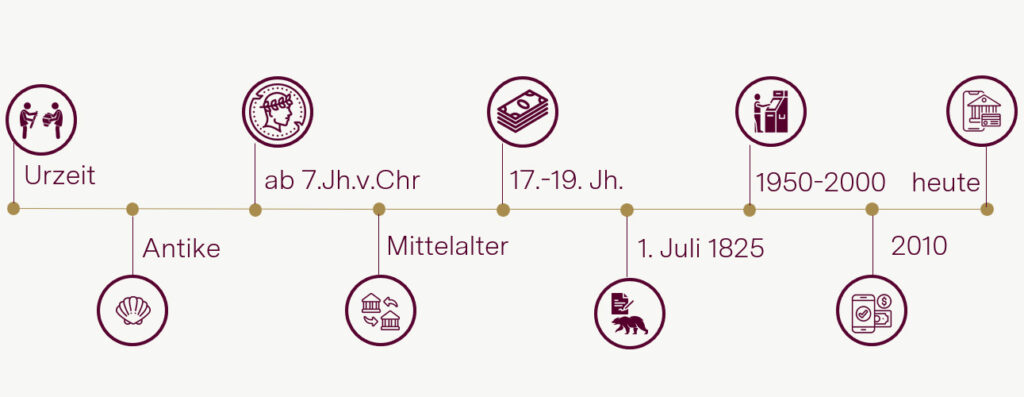 Schon unsere Sprache trägt Spuren früherer Zahlungsformen. So leitet sich «Salär» vom lateinischen Wort salarium ab (Salzration, Salzgeld). Das lateinische Wort pecunia (Geld) leitet sich von «pecus» (Vieh) ab – ebenfalls ein Zahlungsmittel, in vielen Kulturen besonders für die Aussteuer einer Braut. Erst die Entwicklung von standardisiertem Geld in Form von Münzen im Römischen Reich, in Griechenland und später, ausgehend von China, mit dem Papiergeld liess die Bedeutung anderer Zahlungsmittel schwinden. Mit jeder Entwicklung verschwand ein alter Wertträger – aber der Kern blieb gleich: Ein Zahlungsmittel funktioniert nur, wenn Menschen darauf vertrauen, dass es morgen noch etwas gilt.